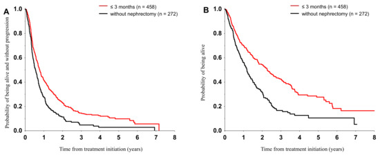 In the present retrospective study using data from the RenIS registry, we analyzed data of patients with de-novo mRCC treated with TT who underwent CN within three months of diagnosis and compared their progression-free survival (PFS) and OS (overall survival) with patients who did not have CN and were treated with TT only. In addition, intermediate-risk patients were analyzed per number of MSKCC risk factors.