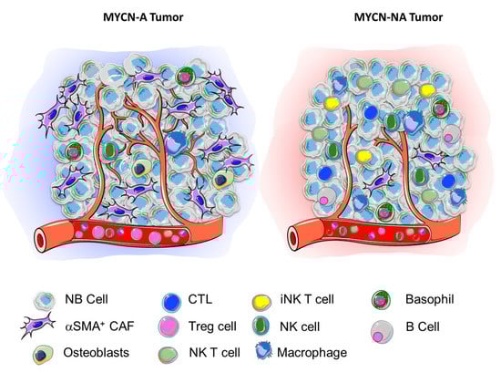 In recent years, several studies examining the landscape of the TME in NB tumors have been published. Because they have used a variety of methodologies, ranging from gene expression analysis of large datasets [,] to histology-based immunohistochemistry (IHC) in human xenotransplanted tumors and patient-derived tumors, they have sometimes generated conflicting data. However, a review of the recent literature described here suggests that there are significant differences in the landscape of the TME between MYCN-A and MYCN-NA tumors in regard to the presence of stromal and immune cells (Table 1).