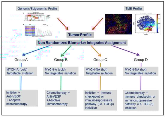 Considering the TME in the design of clinical trials in NB. Simplified conceptual design of a biomarker-integrated umbrella protocol in NB based on genomic and TME information.