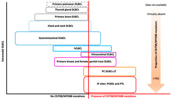 However, a high frequency of mutations involving this pathway has been reported in extranodal DLBCLs not arising in IP sites, such as intravascular large B-cell lymphomas (IVLBCLs), primary cutaneous lymphoma DLBCLs-leg-type (PC DLBCL-LT), vitreoretinal (PVRL), or primary breast DLBCLs, at variable frequency and mostly with concomitant CD79B mutations [47] (Figure 1).