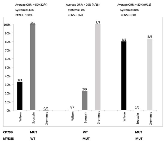 Tumor response rates in three series of patients treated with ibrutinib (Grommes et al. [63], Soussain et al. [64], Wilson et al. [15]) and available mutational status of MYD88 and CD79B. ORR rate for PCNSL refers to the by both Grommes et al. and Soussain et al. [63,64] WT: wild-type; MUT: mutated; ORR: overall response rate; PCNSL: primary central nervous system lymphoma.