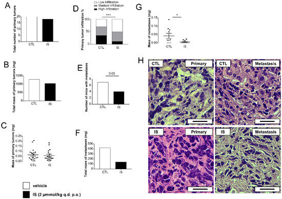 Balb/c female mice were grafted with 4T1 breast cancer cells. Half of the mice received vehicle (sterilized tap water) as a control, while the other half received IS (2 μmol/kg bodyweight). The IS dose corresponds to a 4 μM serum concentration similar to the serum reference range of IS in humans [60]. Per os IS treatment did not inhibit tumor growth (Figure 1A–C), however, IS significantly reduced the infiltration of the primary tumor to the surrounding tissues (Figure 1D). Furthermore, IS treatment reduced the number and mass of metastases (Figure 1E–G). Histology of the primary and the metastatic tumors were not different (Figure 1H).