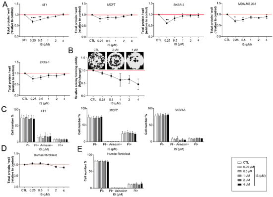 Cellular proliferation was assessed using Sulphorhodamine B (SRB) and colony forming assays as described in Miko et al. and Fodor et al. [16,97]. Cells were seeded in 96-well plates (4T1, 1500 cells/well; MDA-MB-231, 3000 cells/well; SKBR-3, 5000 cells/well; MCF7, 4000 cells/well; ZR75-1, 3000 cells/well; human fibroblast, 7500 cells/well) in complete medium and were cultured with different concentrations of IS for 24 h. Then, cells were fixed by the addition of 50% trichloroacetic acid (TCA, final concentration: 10%) and the plates were incubated for 1 h at 4 °C. Plates were washed five times in water and stained with 0.4% (w/v) SRB solution in 1% acetic acid. Unbound dye was removed by washing five times with 1% acetic acid. Bound stain was solubilized with 10 mM Tris base and the absorbance was measured on an automated plate reader (Thermo Labsystems Multiskan MS, Walthman, MA, USA) at 540 nm.