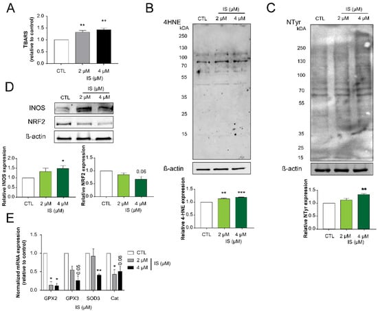 We assessed whether IS can modulate cancer hallmarks that were modulated by other cytostatic bacterial metabolites [16,17,41,47,61,62,63,64,65]. First, we assessed oxidative/nitrosative stress markers, as these are major regulators of cancer hallmarks and cancer progression [66,67,68,69,70]. Levels of thiobarbituric acid-reactive substances (TBARS) and 4-hydroxynonenal (4HNE), both markers of lipid oxidative damage, increased when cells were treated with IS (Figure 3A,B). Next, we assessed nitro-tyrosine (NTyr) levels that indicate protein damage and nitrosative stress [71,72]. NTyr levels were induced by IS treatment (Figure 3C) suggesting increased damage to cells by reactive species and damage to cellular lipids and proteins. These changes correlated with the increased expression of inducible nitric oxide synthase (iNOS) (Figure 3D) and the decreased expression of glutathione peroxidase 2 and 3 (GPX1 and GPX3), superoxide dismutase 3 (SOD3), and catalase (cat) (Figure 3D,E).