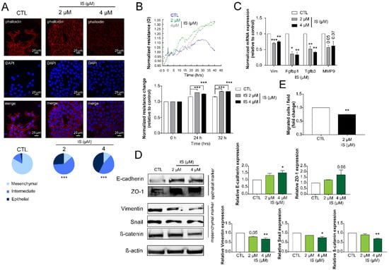 IS treatment induces mesenchymal-to-epithelial transition and blocks cellular migration. (A) 4T1 cells (100,000 cells/well) were treated with IS in the concentrations indicated for 24 h then cellular morphology was observed using Texas Red-X Phalloidin and DAPI staining (representative figure, n = 3). Scale bar corresponds to 25 μm. (B) Total impedance was measured by ECIS (representative figure, mean ± SD, n = 1). (C,D) After IS treatment of 4T1 cells, the expressions of the indicated genes were determined using (C) RT-qPCR (n = 3) and (D) Western blotting (representative figure, n = 3). β-actin was used as a loading control. (E) 4T1 cells (50,000 cells/well) were treated with the indicated concentration of IS for 24 h and, subsequently, the percentages of migrated cells were determined using a Corning Matrigel invasion chamber (n = 3). Cells were counted by the Opera Phoenix High Content Screening System using Harmony 4.6 Software (Perkin-Elmer, Waltham MA, USA). Numerical values are represented as mean ± SEM, except for panel B, where mean ± SD was plotted. Statistical significance was determined using ANOVA followed by Dunnett’s post-hoc tests, except for panel A, where a Chi-square test was conducted. For Dunnett’s tests, all comparisons were made to controls. *, **, and *** indicate statistically significant differences between control and treated samples at p < 0.05, p < 0.01, and p < 0.001, respectively.