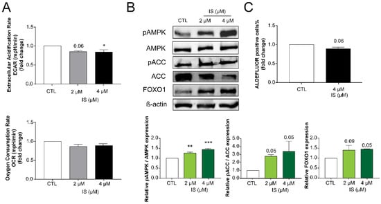 IS treatment had a profound effect on cellular metabolism. IS treatment reduced extracellular acidification rate (ECAR) rendering cells hypometabolic and metabolically less flexible (Figure 5A). Surprisingly, the hypometabolic switch coincided with the induction of key energy sensors, including AMPK phosphorylation or FOXO1 expression (Figure 5B). AMPK activation upon IS treatment was marked by phosphorylation of its alpha subunit on Thr172 and the phosphorylation of a key AMPK target protein, ACC on Ser79 (Figure 5B). Finally, the proportions of ALDH1-positive cancer stem cells decreased upon treatment with IS (Figure 5C), a feature that is linked to changes in cellular metabolism [73,74].