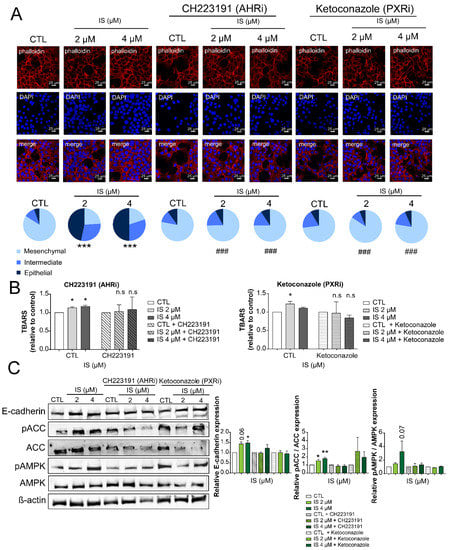 As the next step, we wanted to assess which receptors are responsible for the IS-elicited effects. Indoxyl derivatives exert their effects through the aryl hydrocarbon receptor (AHR) and pregnane-X-receptor (PXR) [53]. We applied pharmacological inhibitors to interrogate the involvement of AHR and PXR in IS signaling. The AHR inhibitor, CH223191, and the PXR inhibitor, ketoconazole, were applied [75,76]. Both CH223191 and ketoconazole blocked IS-elicited mesenchymal-to-epithelial transition (Figure 6A). Inhibition of AHR and PXR also attenuated the IS-induced increases in TBARS (Figure 6B). In addition, IS-induced expression of E-cadherin was blocked by CH223191, but not by ketoconazole (Figure 6C). In contrast, the phosphorylation of ACC and AMPK was blocked by both agents (Figure 6C).