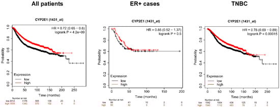 The effects of Cyp2E1 expression on survival in breast cancer were analyzed by kmplot.com, a freely accessible database. Total survival rates were assessed, and all samples are represented in different subpopulations of breast cancer. Numbers in bold represent statistically significant results. The database was accessed on the 30 March 2020.