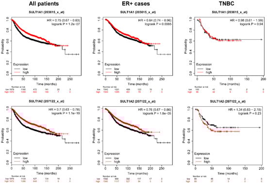 Higher expression of Sult1A1 or Sult1A2 prolongs survival in breast cancer patients. The effect of expression of Sult1A1 and Sult1A2 on survival in breast cancer was analyzed by kmplot.com, a freely accessible database. The data depicted stems from data acquired from microarray experiments and patients were stratified as a function of receptor expression. Total survival rates were assessed, and all samples are represented. The database was assessed on 30 March 2020.