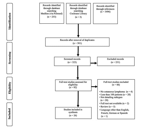 Altogether, 256 publications were identified in the database search, and an additional 3496 records were found in the references of the full-text studies. After the removal of duplicates, 501 articles remained, of which 92 met the inclusion criteria and were read in full. Of these, 26 were included in the meta-analysis. The most frequent reasons for study exclusion were the enrolment of less than 100 patients (1) or the reporting of less than three subtypes of cutaneous lymphomas (2) (detailed in Figure 1). A list of excluded studies is shown in the Table S2, with reasons of exclusion.