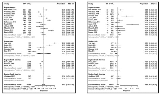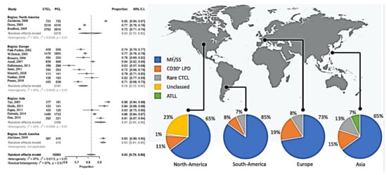 The group of MF and SS, representing 70% of the CTCL, revealed an important heterogeneity between and also within the continents. Their lower frequency in North American studies may be explained by the study design in terms of the used registry. Earlier studies did not distinguish between MF and SS [27]; in this case, a separated evaluation of these diseases was not possible in our meta-analysis. It has to be emphasized that the majority of the American data were derived from the Surveillance, Epidemiology, End Results (SEER) program [10,20,21]. The registry used in these publications was not designed explicitly for cutaneous lymphomas, but for malignant diseases in general. Here, cases with uncertain classifications of CTCL subtype may be classed as “other”, including some early MF cases or rare CTCL, explaining the low numbers of MF cases and high numbers of NOS cases. In Asian countries, the proportion of rare CTCL was higher, affecting the MF/SS proportions. While SS represented everywhere 3% of CTCL, the relative frequency of MF was heterogenous. This suggests the influence of environmental factors in the pathogenesis of the latter. The geographical clustering of MF cases, and the occurrence of MF in married couples and families, has been reported in other studies [5], and raises the possibility of an environmental trigger for this malignancy. Lifestyle factors, or industrial exposures [3], may contribute to the pathogenesis of the disease. UV exposure has also been suspected to play a role in the disease pathophysiology [40]. A recent study suggested the role of environmental toxic exposures to benzene and trichloroethylene in the pathogenesis of cutaneous lymphomas [41].