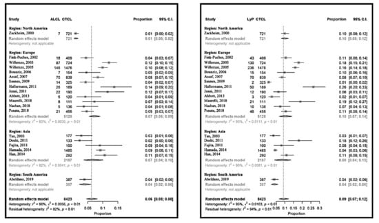 The relative frequency of CD30-positive LPDs varied between 6% (95% CI 5% to 7%) [10] and 40% (95% CI 33% to 48%) [32] in the USA and Germany, respectively (Figure 4 and Figure S2). The heterogeneity between the studies was the lowest in Asia, this being 15% (95% CI 11% to 21%). The proportions were more homogeneous for ALCL, at around 7% (95% CI 5% to 9%). The relative frequency of LyP was 9% (95% CI 7% to 12%), with a similar pattern.