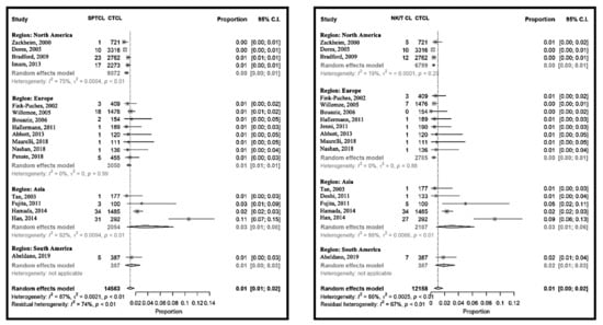 The relative frequency of rare cutaneous T-cell lymphomas was 6% (95% CI 4% to 10%) and varied between 1% (95% CI 1% to 2%) [20] and 9% (95% CI 8% to 11%) [31] with the exception of Japan [11,24] and South Korea [25] (Figure 5 and Figure S2). Here, the relative frequencies were 27% (95% CI 19% to 37%) [11] and 39% (95% CI 33% to 45%) [25], respectively. Within the rare CTCL, subcutaneous panniculitis-like lymphoma, NK/T-cell lymphoma (Figure 5) and primary cutaneous T-cell lymphoma not otherwise specified (Figure S4) were more frequent in Asia. Adult T-cell lymphoma and leukemia (ATLL) were not included in the rare cutaneous lymphomas as a group, and were also more frequent in the reports from the Far East (Figure S2). On the other side, other rare lymphomas, including aggressive epidermotropic CD8-positive T-cell lymphoma, primary cutaneous Gamma-Delta T-cell lymphoma and small-medium cell CD4-positive T-cell lymphoma seemed to have similar frequencies around the world. Both within the continents and between the studies, the heterogeneity was importantly lower for each of these latter rare CTCL than for the frequent ones (Figure 5 and Figure S4 ).