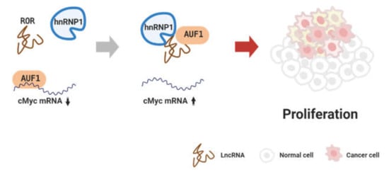 - Huang, J.; Zhang, A.; Ho, T.T.; Zhang, Z.; Zhou, N.; Ding, X.; Zhang, X.; Xu, M.; Mo, Y.Y. Linc-RoR promotes c-Myc expression through hnRNP I and AUF1. Nucleic Acids Res. 2016, 44, 3059–3069. [Google Scholar] [CrossRef] [PubMed]