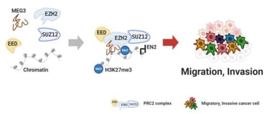 - Zhou, Y.; Yang, H.; Xia, W.; Cui, L.; Xu, R.; Lu, H.; Xue, D.; Tian, Z.; Ding, T.; Cao, Y.; et al. LncRNA MEG3 inhibits the progression of prostate cancer by facilitating H3K27 trimethylation of EN2 through binding to EZH2. J. Biochem. 2020, 167, 295–301. [Google Scholar] [CrossRef]