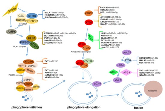 Competing endogenous RNAs (ceRNAs) regulate autophagy in cancers. ceRNAs regulate autophagosome initiation or phagophore elongation by upregulating mTOR, ULK1, ATG13, ATG14L and Beclin-1, or ATG12, ATG5, ATG7, ATG4, and ATG3, respectively.