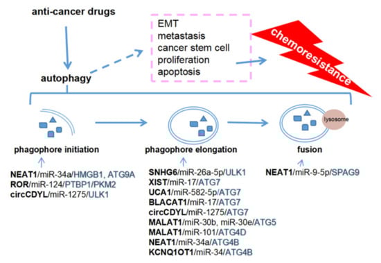 Competing endogenous RNAs (ceRNAs) regulate autophagy to promote chemoresistance. NEAT1 and ROR are involved in the initiation of phagophore formation, and SNHG6, XIST, UCA1, BLACAT1, KCNQ1OT1, MALAT1, and NEAT1 in the elongation of autophagosome. NEAT1 also regulates lysosome localization by upregulating SPAG9. ceRNAs-mediated autophagy may promote chemoresistance via EMT, metastasis, cancer stem cells, proliferation, and apoptosis.
