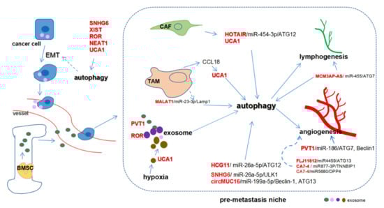 Competing endogenous RNAs (ceRNAs) regulate metastasis through autophagy. Cancer-associated fibroblasts (CAFs) increase HOTAIR and UCA1 expression while tumor-associated macrophages (TAMs) upregulate UCA1 through CCL18. MALAT1/miR-23-3p regulates autophagy in macrophages. MCM3AP-ASinduces lymphatic vessel formation while PVT1 promotes angiogenesis by sponging miR-186. FLJ11812- and CA7-4-mediated autophagy may be essential for angiogenesis. PVT1, ROR, and UCA1 can be packaged in exosomes to promote metastasis. PVT1 can be encapsulated in exosomes derived from bone marrow mesenchymal stem cells (BMSC) while exosomal UCA1 is induced substantially by hypoxia.