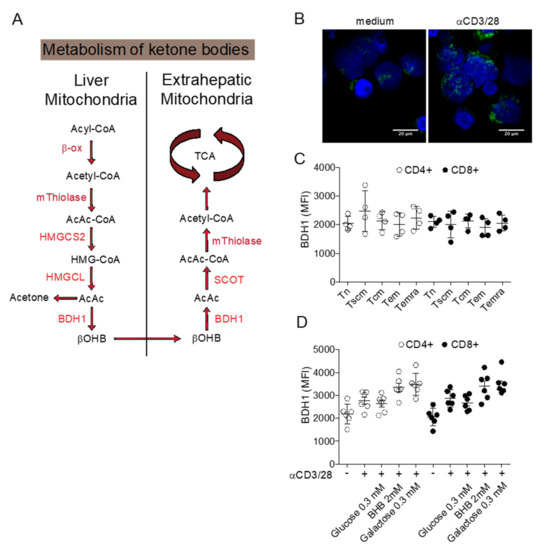 Metabolism of ketone bodies. (A) Schematic representation of ketone bodies synthesis in the liver and utilization as metabolic substrate in extra-hepatic tissues. (B) Confocal image of BDH1 positive mitochondria in resting and activated T cells. (C) Expression of BDH1 in CD4+ and CD8+ T cell subsets. (D) Changes in BDH1 expression in CD4+ and CD8+ T cells cultured in vitro in different conditions. BDH1: D-beta-hydroxybutyrate dehydrogenase; SCOT: Succinyl-CoA: 3-ketoacid-coenzyme A transferase; HMGCL: hydroxymethyl-3-methylglutaryl-CoA lyase; HMGCS2: 3-hydroxy-3-methylglutaryl-CoA synthase 2; TCA: tricarboxylic acid cycle.