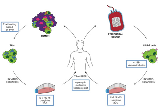 Current procedures for adoptive T cell therapy involve three stages that are amenable to metabolic manipulation (Figure 2). The first stage is the selection of primary cells from patients. This mainly applies to ex-vivo isolation of tumor infiltrating lymphocytes (TIL) for in vitro expansion. A promising strategy is to isolate TIL according to their mitochondrial membrane potential (ΔΨm) [75], suggesting a novel approach to isolate therapeutic T cells based on metabolic fitness. The selection of T cells is based on the uptake of the lipophilic cation dye tetrametylrhodamine methyl ester (TMRM), allowing to discriminate between CD8+ T cells with a low or high ΔΨm. T cells sorted according to a low ΔΨm showed a better metabolic fitness during in vitro expansion and an improved capacity of the long-term persistence and eradication of established tumors once transferred in vivo in animal models. This method allows ex vivo isolation of metabolically improved T cells, is potentially applicable to both CD4+ and CD8+ T cells, and can be used to avoid the presence of unfit T cells in the initial preparation of T cells. Most protocols for the generation of therapeutic T cells involves protocols for extensive in vitro expansion in order to obtain a sufficient number of cells for an effective anti-tumor response upon in vivo transfer. An enhanced glycolytic metabolism is associated with increased expansion, early proliferation, and production of effector cytokines, such as IFN-γ. On the other hand, an oxidative metabolism promotes the generation of memory clones, with a less potent effector function but with a superior long-term survival and anticancer effectiveness in vivo. Several approaches have been tested to modify the metabolic signature of T cells. The adoptive transfer of T cells expanded in vitro in the presence of 2DG to limit glycolysis, showed and enhanced anti-tumor activity in a mouse model of melanoma [24]. In mouse models of melanoma, pharmacologic inhibition of the serine/threonine kinase Akt achieved by using Akt inhibitor VIII (PubChem Compound Identification: 10196499) during in vitro expansion of TIL has led to the generation of a long-lived and memory-like T cell pool with potent anti-tumor activity [76]. Metabolic manipulation was also tested in CAR T cells to improve longevity and to induce a memory-like phenotype. The 4-1BB co-receptor signaling domain was included into the CAR architecture, inducing mitochondrial biogenesis and oxidative metabolism that associated with a central-memory phenotype and improved longevity and persistence [77]. In contrast, the inclusion of the CD28 signaling domain resulted in highly glycolytic T cells with improved effector function but reduced persistence.