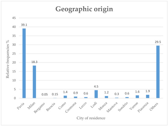 A total of 469 patients accessed our division for cancer therapy during the lockdown period compared with 636 patients in the same period in 2019, 612 patients in 2018, 591 in 2017, and 604 in the year 2016. In 2020, the patients’ median age was 69 years (range 34–90), and 32% were male, whereas 68% were female. In the majority of cases, they came from Lombardy (68,7%) and in particular from Pavia and its province (39,1%), Milan and its province (18,3%), and Lodi and its province (4,5%) (Figure 1).