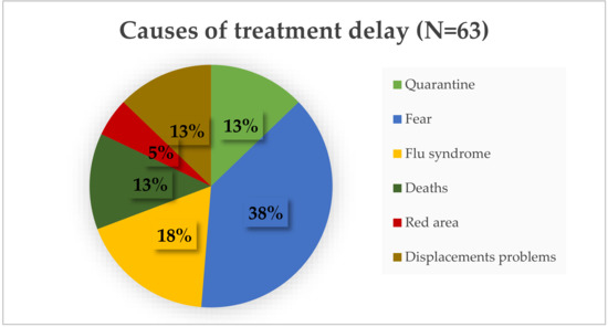 As a secondary objective, 63 patients had their treatment delayed due to COVID-19-related reasons (Figure 3). The median age of these patients was 70 years old; the majority had metastatic breast cancer (62%) and came from a city outside Pavia and its province (66%).