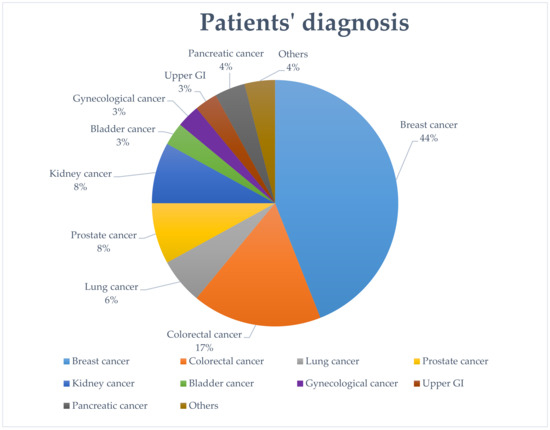 We then analyzed the clinical characteristics of patients accessing our division in 2020, according to cancer type and treatment received (both treatment setting and type of drugs). Breast cancer was the most common diagnosis (44%), followed by colorectal cancer (17%), prostate cancer (8%), kidney cancer (8%), lung cancer (6%), pancreatic cancer (4%), gynecological (3%), bladder and upper gastrointestinal cancer (3%), and others (4%) (Figure 4).