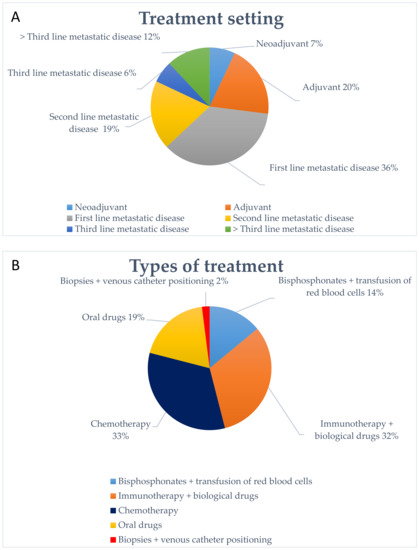 The majority of our patients were treated for a metastatic disease (73%), and in a minor percentage for an early stage cancer (33%). Among the treatments for advanced disease, the first line setting was the most represented and only a minority of patients accessed the hospital for advanced lines of treatment. In particular, 36% of patients received treatment as a first line setting, 19% as second line, 6% as third line, and 12% beyond the third line; moreover, 20% of patients received a treatment in adjuvant setting, while 7% in a neoadjuvant setting (Figure 5A).