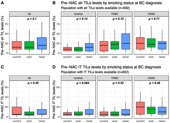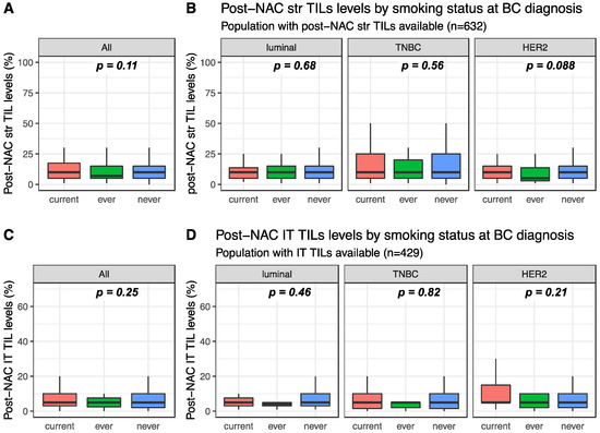 Post-NAC str and IT TILs were available for 632 and 429 patients, respectively. Post-NAC median str TIL levels were not significantly different between current, ever and never smokers in the whole population (10%, 7% and 10%, respectively, p = 0.108, Figure 3A) nor in each BC subtype (Figure 3B). Similar results were found for post-NAC IT TIL levels both in the whole population (5%, 5% and 5%, respectively, p = 0.254) and in each BC subtype population (Figure 3C,D respectively).