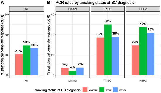 pCR rates according to smoking status at BC diagnosis, in the whole population (A) and by BC subtype (B).