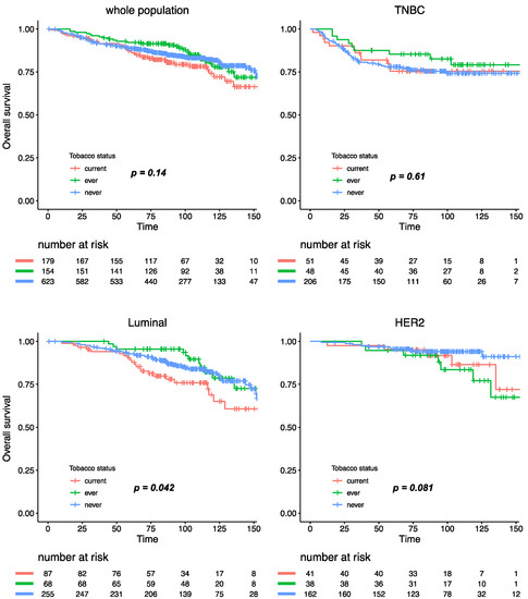 With a median follow-up of 101.4 months, 293 patients experienced relapse, and 173 died. Tobacco smoking was not significantly associated with relapse-free survival (RFS), either in the whole population, or after stratification by BC subtype (Figure 4). Similar results were observed for overall survival, where tobacco smoking at diagnosis had no impact at all on mortality in the whole population (Figure S3). After subgroup analysis by BC subtype, patients with luminal BC who were current smokers had a worse overall survival when compared with ever or never smokers (Pinteraction smoking status /BC subtype = 0.11), but this association was no longer significant after multivariate analysis (Table S1).