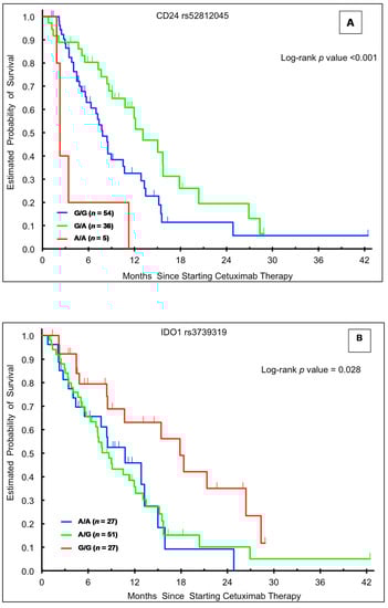 Studies examining the effect of these SNPs on gene function as well as associations between genotype/haplotype and immune cell subsets, serum cytokine levels, PDL-1 status, tumor mutational burden, and pathologic features (e.g., poor differentiation, tumor infiltrating lymphocytes, mucinous histology) may provide mechanistic explanations for the observed findings and better characterize the link between genotype and clinical outcomes. The presence of microsatellite instability (MSI) and BRAF V600E mutations also affect the tumor immune milieu and may have influenced the relationship between germline variants and outcomes; this information was not available in the present study. Therefore, further investigations should evaluate the effect of MSI and BRAF mutation status (V600E and perhaps non-V600E) on the predictive and prognostic utility of CD24 or IDO1 genotype, especially as it pertains to the efficacy of immune therapy combinations [53]. For instance, avelumab is currently being tested in combination with FOLFOXIRI plus cetuximab in the mCRC frontline setting in the phase 2 AVETRIC trial (NCT04513951). Others are examining the efficacy of first-line FOLFIRI plus cetuximab in mCRC patients based on FCγ-receptor genotype in the phase 2 CIFRA trial (NCT03874026). Specific germline polymorphisms or composite haplotypes, in conjunction with tumor features (e.g., sidedness) and molecular profile (e.g., RAS, BRAF, HER2, MSI status, CMS subtype) may serve to inform the selection of mCRC patients to treat with cetuximab and other targeted or immune therapies.