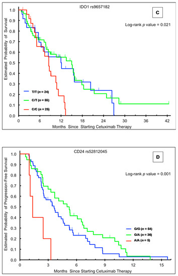 CD24 maps to chromosome 6q21 and rs52812045 is located in the GPI-anchor cleavage site [34]. Clinically, this polymorphism has been associated with pathologic complete response and concomitant intra-tumoral lymphocyte infiltration in breast cancer patients [35,36], and poor prognosis in esophageal cancer patients [37]. However, a recent meta-analysis of CD24 SNPs and cancer risk was non-confirmatory [38]. In our study, carriers of the CD24 rs52812045 A/A variant in the training cohort had the shortest PFS and OS compared to those with the G/G and G/A genotypes, with heterozygotes appearing to have an OS advantage (albeit with the 95% CI boundary near 1 in univariable analysis). Similarly, in the Japanese validation cohort, the A allele was associated with shorter PFS. It is important to note that very few patients carried the A/A genotype which limits the power of the analysis. In addition, patients in the training cohort received cetuximab monotherapy or cetuximab combined with irinotecan, while patients in the Japanese cohort received cetuximab combined with a fluoropyrimidine (5-FU or S-1) and oxaliplatin. Each cytotoxic agent has its own immunomodulatory effects or may impact those seen with cetuximab, and this may have influenced our results. Nonetheless, our findings warrant further evaluation. If confirmed in larger, prospective studies, CD24 rs52812045 genotype may be used to select mCRC patients most likely to benefit from cetuximab-based regimens in clinical practice.