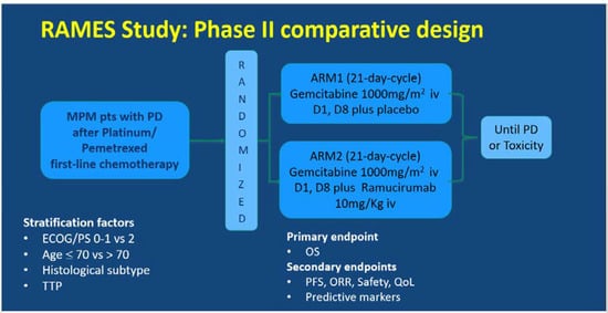 The RAMES Study (EudraCT number 2016-001132-36) is a multicenter, double-blind, randomized Phase II trial exploring the efficacy and safety of the addition of ramucirumab to gemcitabine as a second-line treatment for patients with malignant pleural mesothelioma. The RAMES Study is being conducted in 26 Italian oncology centers, in accordance with the International Council on Harmonization Good Clinical Practice guidelines and the Declaration of Helsinki (Figure 1).