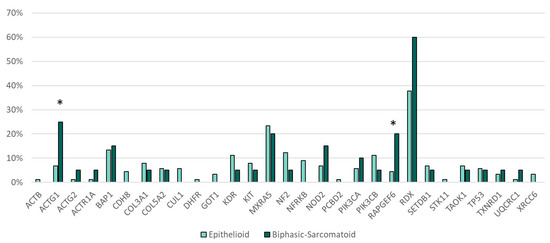 Genetic alterations in RAPGEF6 (p = 0.035) and ACTG1 (p = 0.027) were more frequent in the sarcomatoid and biphasic subtype of MPM as compared with the epithelioid subtype (Figure 3).