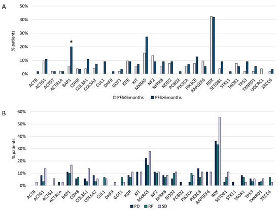 (A) Gene mutations and first-line chemotherapy PFS. (B) Gene mutations and first-line chemotherapy ORR. * Statistically significant (BAP1 p = 0.04).