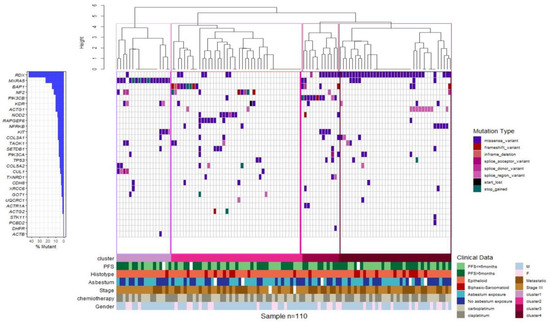 Unsupervised clustering identified four molecular MPM subgroups on the basis of the genetic alterations identified in the gene panel. Cluster 1 was defined by a high incidence of MXRA5 mutations, cluster 2 included the majority of MPM cases mutated in BAP1, NF2, NOD2, or RAPGEF6, cluster 3 was comprised of 91% of MPM cases mutated in PIK3CB, and cluster 4 included the majority of MPMs mutated in RDX and more than 80% of cases mutated in ACTG1 (Figure 5). As a whole, the clinicopathological characteristics, including age, sex, asbestos exposure, stage (III and IV), ORR and PFS at the first-line treatment, and histological type, did not have a significantly different distribution among the four groups.