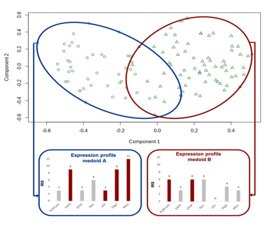 The results were corroborated with PAM analysis (Figure 3). This method also detects a medoid for each cluster, i.e., the sample with the most characteristic immunohistochemical profile of each cluster. These profiles were very similar to those of the mean scores of the two clusters that were achieved by hierarchical clustering. We chose the PAM results for further analysis as (a) calculating the medoids gives an intuitive insight into the “most typical” member of each group and (b) through distance calculation, assigning new samples to one of the two clusters is very straightforward.