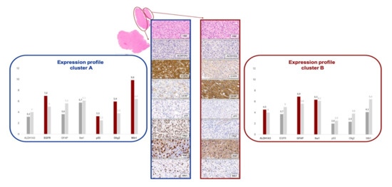 Forty-six AoI of 23 tumors were assigned to cluster A by PAM clustering. The areas of this cluster show a high proliferation index (mean Mib1 value 38.8%, range 20–90% compared to mean Mib1 value of Cluster B of 15.7%, range 5–90%), which justifies the additional name proliferating subtype in our sample collective. The cluster is further characterized by high expression of EGFR, p53, and Olig2. The positive correlation of these three markers collaborate the profile observation (see also Table 1). EGFR is a well-known marker of the classical subtype of the TCGA classification by Verhaak et al. [2]. In cluster A, the mean immune reactive score (IRS) adds up to 7.0 as compared to an average of 5.0, taken all AoI together. The strong EGFR positivity of the classical/proliferating subtype suggests a close relation to the classical subtype described by Verhaak et al. [2]. Furthermore, Olig2 shows a higher IRS in this cluster (IRS 5.9 compared to an average of 3.8). For the expression profile of the classical/proliferating subtype, see also Figure 4.
