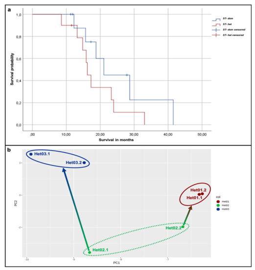 Survival analysis and principal component analysis (PCA) of epigenetic examination. (a): By Kaplan–Meier method, a shorter survival of patients with ST-dom tumors compared to patients with ST-het tumors can be observed (p = 0.166). (b): The methylation profile of each two different AoI of three tumors was examined. PCA revealed a proximity of the both samples of tumors Het01 and Het03. Interestingly, the methylation profiling confirms the allocation of the samples of tumor Het02 to the two different clusters by PAM, as one AoI shows a distinct nearer proximity to the samples of Het01 as to the other AoI of the same tumor sample.