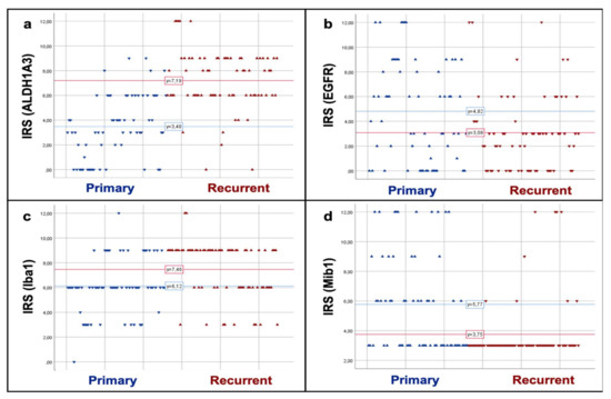 Seventy-four (92.5%) of the 80 AoI were assigned to this subtype by PAM clustering, whereas only six (7.5%) were grouped into the classical/proliferating subtype. When only taking in account the recurrent tumors with corresponding primary, 69 of 72 AoI (95.8%) were clustered into the mesenchymal/microglial-dominant subtype, whereas only three (4.2%) were assigned to the classical/proliferating subtype. This led to an assignment of 19 of 21 (90%) recurrent tumors to ST-dom, whereof all were mesenchymal/microglial-dominant. The remaining two (10%) tumors belonged to the ST-het group. Figure 6 demonstrates the expression levels of ALDH1A3 (a), EGFR (b), Iba1 (c), and Mib1 (d) in AoI of primary tumors when compared to recurrent tumors. Mean IRS for ALDH1A3 and Iba1, both markers for the mesenchymal/microglial-dominant subtype were much higher in the recurrent tumors compared to the primary tumors (mean IRS for ALDH1A3: 7.19 vs. 3.48; mean IRS for Iba1: 7.46 vs. 6.12). In contrast, EGFR and Mib1, both markers for the classical/proliferating subtype, decreased between primary and recurrent tumors (mean IRS for EGFR: 4.82 vs. 3.08; mean score for Mib1: 5.77 vs. 3.75). T-test analyses showed a significant increase of ALDH1A3 and Iba1 in the progression (p = 0.000 and p = 0.001) and significant decrease of EGFR and amount of proliferating cells (p = 0.005 and p = 0.000).