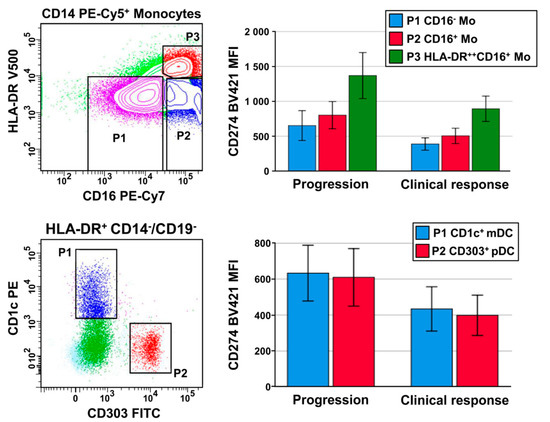 Gating strategy and PD-L1/CD274 mean fluorescence intensity (MFI) for CD14+CD16-negative classical monocytes, CD14+CD16+ monocytes and CD14+HLA-DR++CD16+ intermediate monocytes (upper part), and for CD1c+ myeloid DC (mDC) and CD303+ plasmacytoid DC (pDC) (lower part of the picture). Bars illustrate mean value and standard error with a significant difference between the outcome “progression” and “clinical response” with respect to the PD-L1/CD274 intensity of CD14+CD16-negative monocytes (p = 0.029), CD14+CD16+ monocytes (p = 0.034), CD14+HLA-DR++CD16+ monocytes (p = 0.027), CD1c+ mDC (p = 0.041) and pDC (p = 0.042).