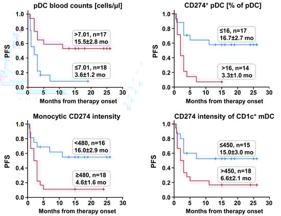 Patients with a higher PD-L1/CD274 expression of monocytes and DC subtypes, respectively, showed a significantly poorer survival. Figure 2 illustrates that patients with an initial value of >7.01 pDC/μL blood, ≤16% CD274+ pDC, a monocytic CD274 intensity of <480 and a CD274 intensity of CD1c+ mDC ≤450 had a significantly longer PFS.