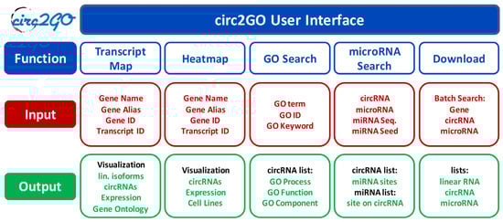 The structure of the circ2GO database. Five modules are implemented as user interfaces within circ2GO, offering multiple functionalities (blue) and their input (red) and output (green): (1) Visualization of all linear and circular isoforms for a gene including their cumulative expression in the Transcript Map as well as additional information; (2) Visualization of the expression of all circular RNA (circRNA) isoforms in the individual cell lines in a Heatmap; (3) GO search enables the searching for all genes and their circRNAs linked to a biological process, molecular function or cellular component; (4) microRNA search enables the searching for all microRNAs with binding sites on a circRNA, or all circRNA harboring binding sites for a microRNA; (5) Download options for all categories.