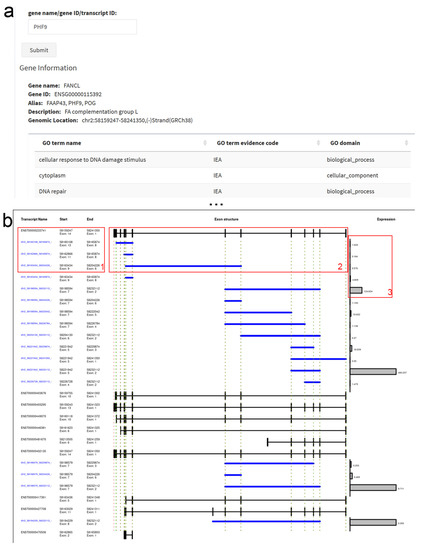 circRNA Transcript Map. (a) The search input accepts the gene name, alias or circRNA ID; the gene information box contains further information including GO (gene ontology) terms. (b) The Transcript Map shows transcript (black) and circRNA (blue) IDs and coordinates (1), the linear exons and introns as well as the circRNAs (2), and the total circRNA read counts in all cell lines (3). The dashed lines indicate exon starts and ends mapped from the first linear to the circular RNAs.