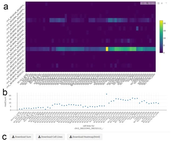 The circRNA heatmap depicts the circRNA read counts in each cell line. The expression profile for the gene of interest can be viewed either as a heatmap (multiple circRNAs included) (Figure 3a), or as a classical scatter plot (only one circRNA included) (Figure 3b). Both plots display the same order of cell lines, and the order of circRNAs matches the order in the transcript map. Heatmap representation is generated through clustering with a complete linkage algorithm. The scale bar for the heatmap shows the abundance level of the circRNAs. Hovering over the heatmap gives the read count value (normalized to library size) and the name of the cell line. In addition to displaying the expression profile in plots, the average circRNA expression for each cell line, as well as the total circRNA counts can be downloaded.