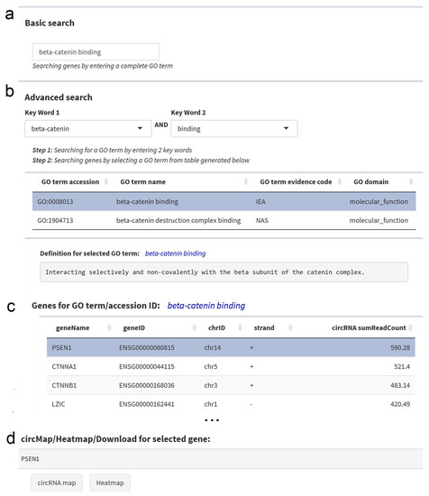 Gene Ontology (GO) Search Panel. (a) The basic search option allows for the search of GO terms, GO IDs or keywords. (b) The advanced search option allows for the combination of keywords from lists of keywords in GO terms. By selecting one row in the search results, the annotation for the respective GO term is shown below. (c) A table lists genes associated with the respective GO term, as well as the total abundance of the circRNAs derived from each gene in all cell lines. (d) At the bottom, direct links to the circRNA transcript map and the circRNA heatmap are provided for the selected gene.