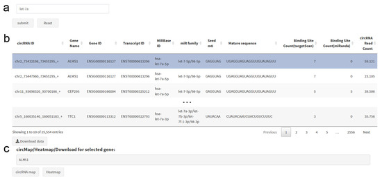 circRNA–microRNA Search Panel. (a) The search can be performed for gene name, gene ID, circRNA ID, microRNA name, miRBase ID, microRNA sequence or microRNA seed sequence. (b) The results table lists pairs of circRNAs and microRNAs, which can also be downloaded. (c) At the bottom, direct links to the circRNA transcript map and the circRNA heatmap are provided for the selected gene.
