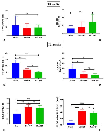 Conversely, TTP assessed by means of FLER was significantly higher in the sham group (24.4 ± 4.9 s) when compared to max-IGP (10 ± 1.5 s, p-value = 0.0008). TTP was also inferior in min-IGP (14 ± 1.7 s) when compared to the sham group, but this difference did not reach any statistical significance. No difference was encountered between the two IGP groups (Figure 1C,E).