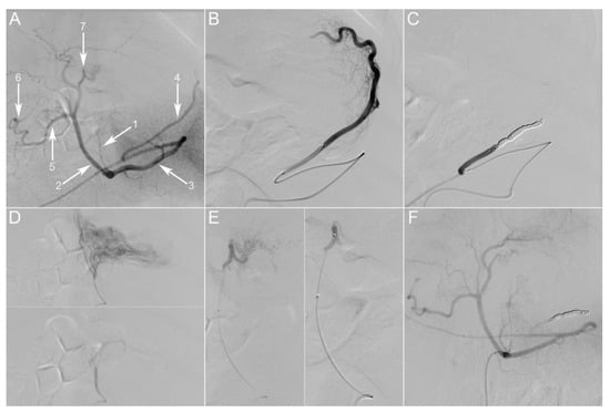In strictly aseptic conditions, a 5 French sheath was introduced into the right femoral artery under ultrasound guidance. A 5 French Cobra-2 catheter (Terumo Europe NV, Leuven, Belgium) was placed at the origin of the celiac trunk and a selective DSA was performed using 10 mL of contrast medium at a rate of 4 mL/s (VISIPAQUE 270, GE Healthcare, UK) (Figure 2A–E).